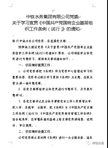 中铁水务公司各单位认真学习宣贯《中国共产党国有企业基层组织工作条例(试行)》