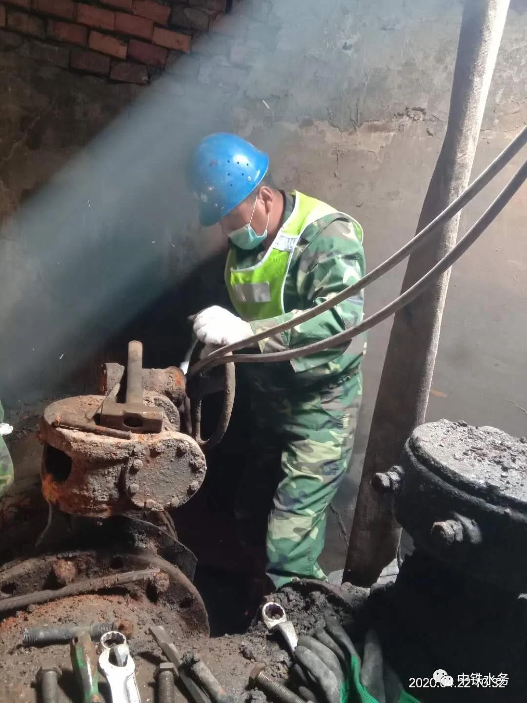要把原来的旧四通管卸下来可不容易,加上是老旧和材质的原因,他想尽一切办法,用锤子砸、用乙炔割枪烧、用倒链拉等等,由于坑内空间有限,维修人员不断调整位置、姿势,水花、碎片在脸上划过,连续十几个小时的应急抢修全面告捷,缩短了停水时间,及时保障了全市居民的用水需求。