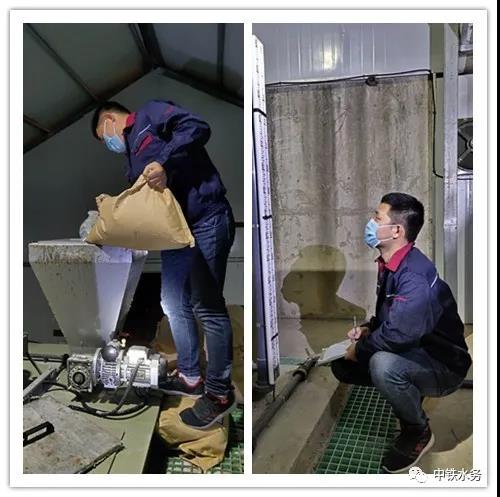 广德中铁水务运行车间运行员在加药间进行PAM配药,根据水量水质调整加药量