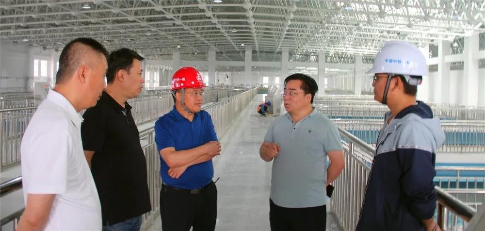 5月15日上午,刘占伟首先来到了西夏水库、银川水厂现场。西夏水库改扩建后承担黄河水自青铜峡市取水泵站引入银川水厂的调蓄任务。目前,西夏水库施工任务已接近尾声,剩余下游坝坡砌护、坝顶道路及相关附属,输水塔、流量控制室装修以及厂区附属施工等施工任务。银川水厂建成向银川市三区两县供水,保障水质安全,满足用水需求。剩余厂区绿化景观、道路及各单体装修收尾及消缺工作。在银川水厂水处理设施间,项目办工程前期部黎小龙详细地介绍了西线供水项目情况、水处理工艺流程。