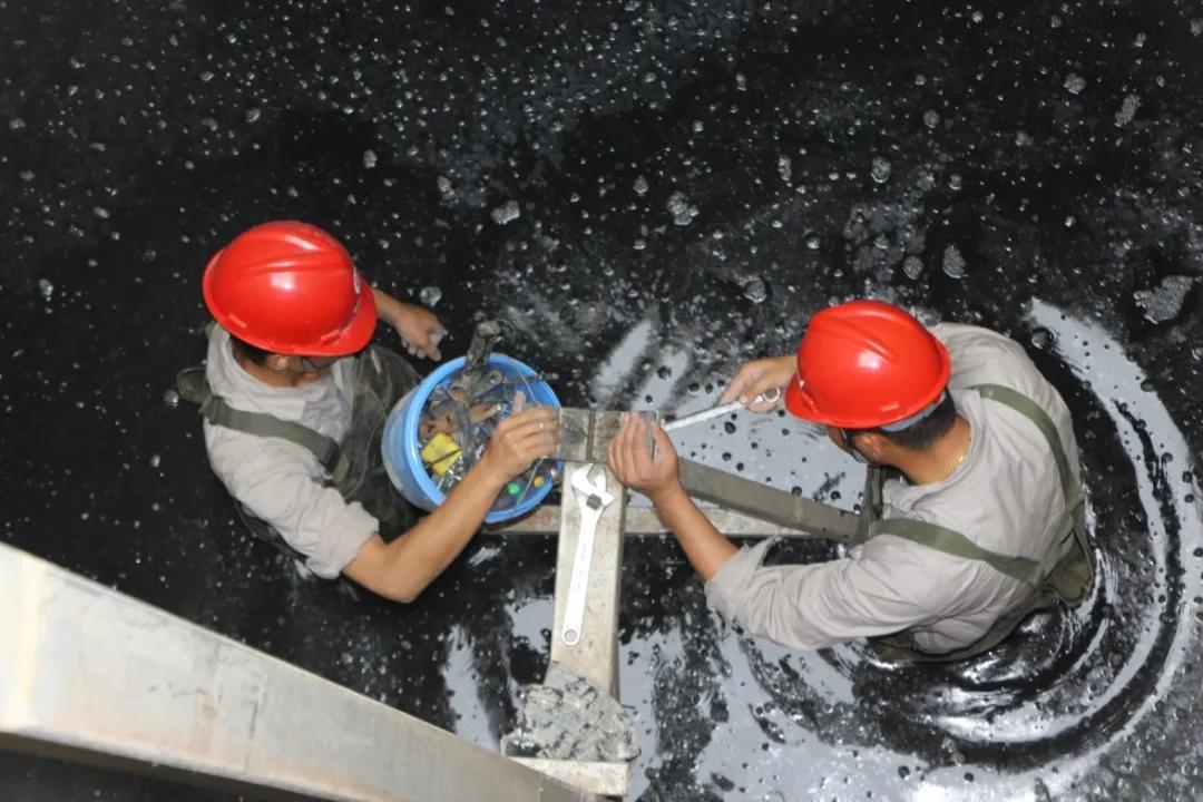 维修人员下到深达五米的氧化沟进行检修