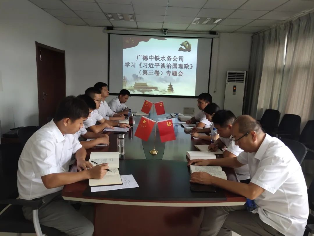 9月16日上午,广德中铁水务公司党支部开展《习近平谈治国理政》(第三卷)专题学习会。项目公司班子成员、全体党员及部门负责人参加了学习会并交流了心得体会。学习会由项目公司党支部书记李小龙主持。