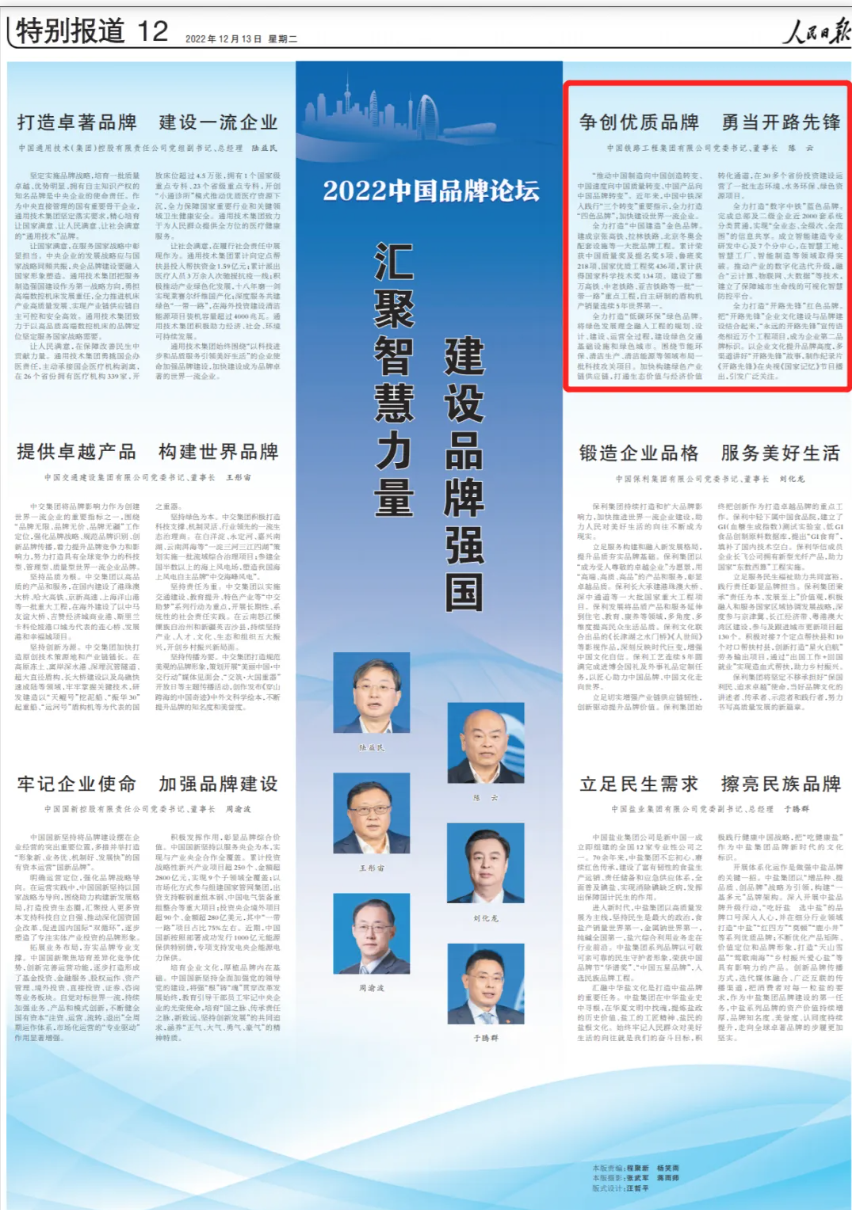 12月13日,《人民日报》“2022中国品牌论坛”特别报道刊发中国中铁党委书记、董事长陈云署名文章《争创优质品牌勇当开路先锋》,全面展示了中国中铁深入践行“三个转变”重要指示,全力打造“四色品牌”,加快建设世界一流企业的生动实践和丰硕成果。