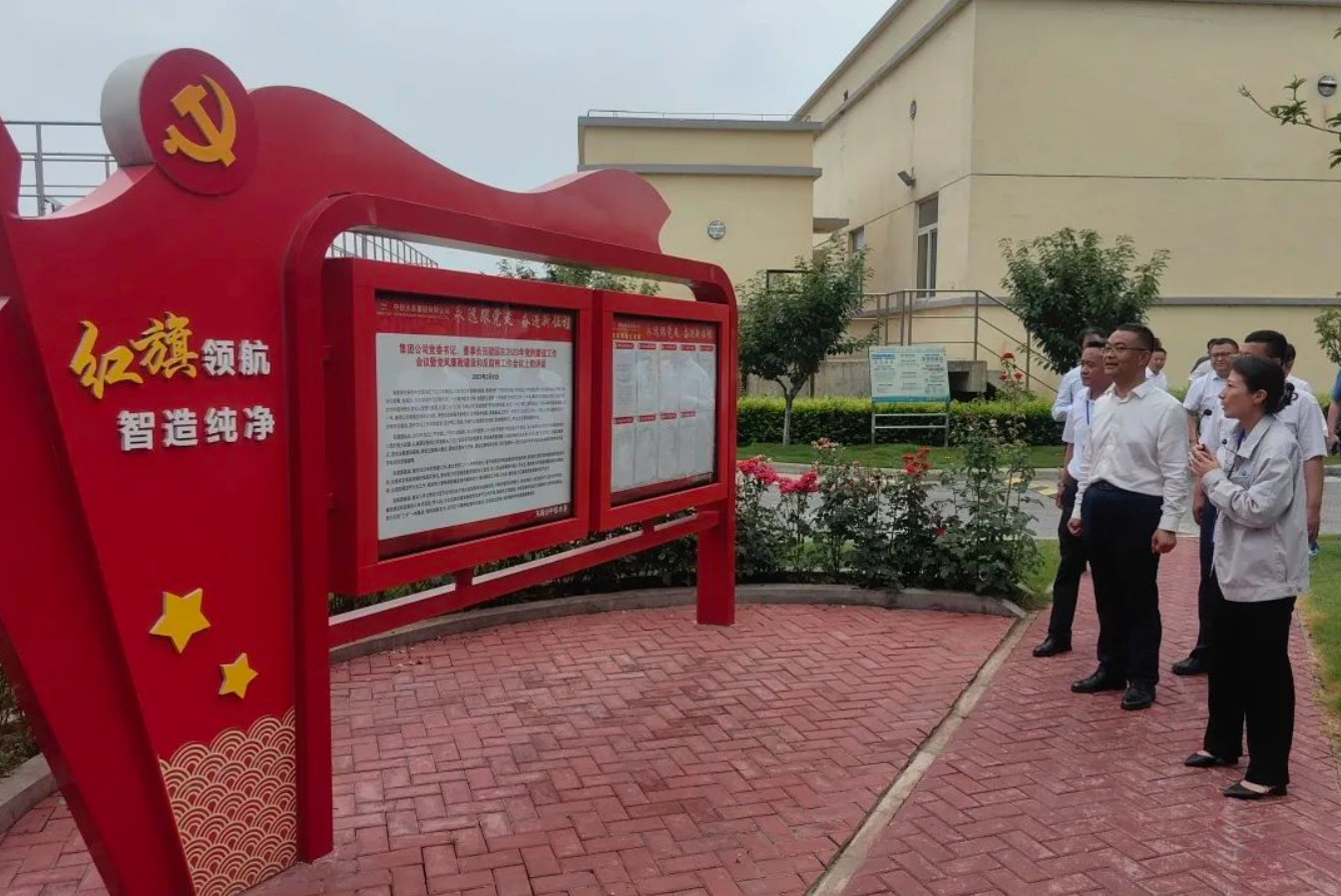 王耀辉一行深入水厂,详细了解马鞍山中铁水务的项目基本情况及二期提标扩建背景,查看了马鞍山中铁水务预处理、生物处理及深度处理等流程,在配水井、二沉池等区域实地考察,并参观了厂区警示教育点、“党史文化长廊”及“红旗领航智造纯净”党建宣传阵地。