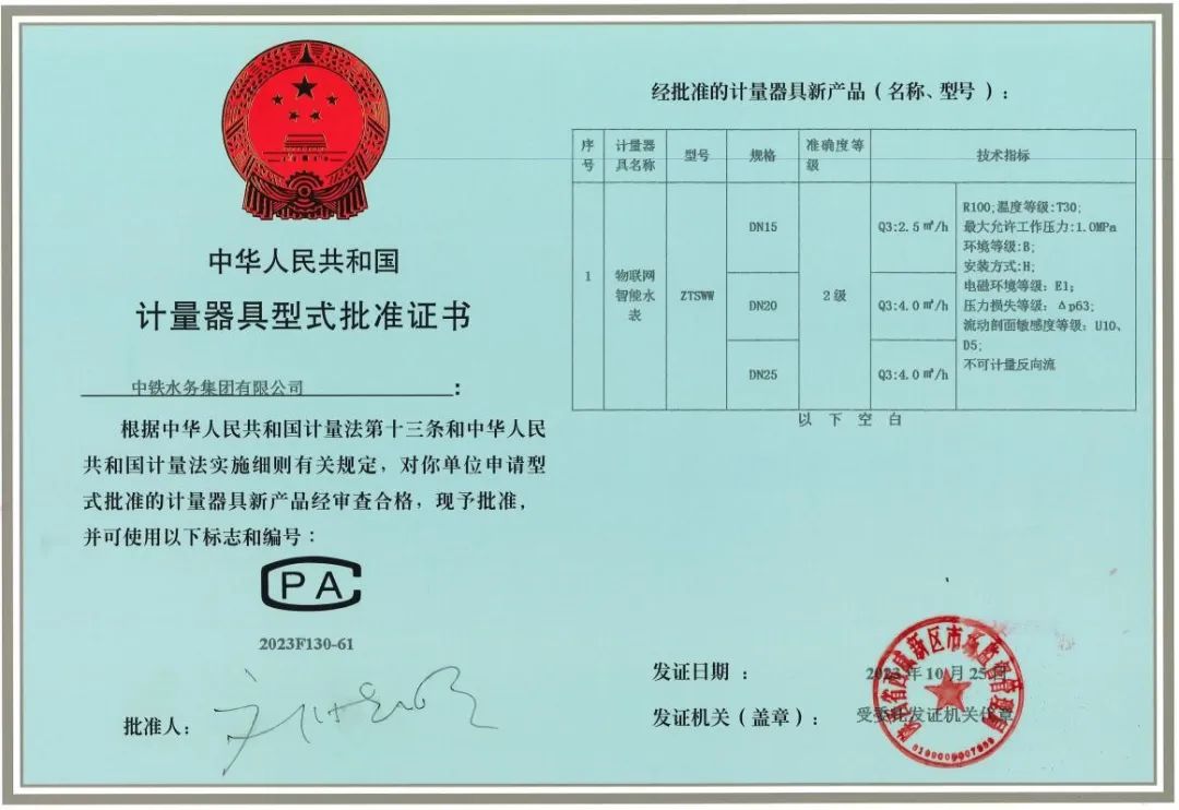 喜报!中铁水务成功获批物联网智能水表计量器具型式批准证书