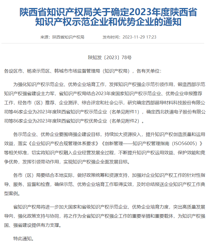 “陕西省知识产权优势企业” 是为推动知识产权强国、强企目标而设立,由陕西省知识产权局组织认定,是陕西省知识产权界的最高荣誉,代表企业具备知识产权战略管理理念,具有知识产权的创造、运用、保护和管理能力。