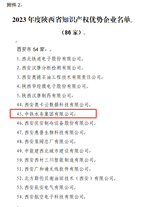 近日,陕西省知识产权局发布《关于确定2023年度陕西省知识产权示范企业和优势企业的通知》,中铁水务成功入选2023年度陕西省知识产权优势企业。