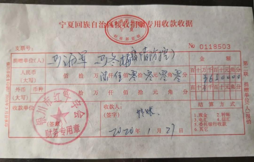 在新型冠状病毒感染的肺炎疫情发生后,马冬梅和家人从电视新闻、微信等看到武汉的疫情非常严重,一线的警察、医生护士、社区工作人员等,缺少口罩及护目镜等防控物品,就和家人商量,采取网上订购口罩快递邮寄的方式援助疫情防控一线的工作人员。但由于当时物资紧缺等原因未能达成心愿。经网上查询银川市红十字会电话,联系咨询后,马冬梅和丈夫马海军决定将6000元捐赠给银川市红十字会,用于国家统一购买急需的防护用品,援助疫情一线工作人员。当她的女儿马索菲娅听到爸爸妈妈为抗击疫情捐款,也拿出500元的压岁钱一起进行捐助。1月27日,马冬梅家庭将6500元捐给银川市红十字会,表达对疫情防控一线工作人员的爱心援助。