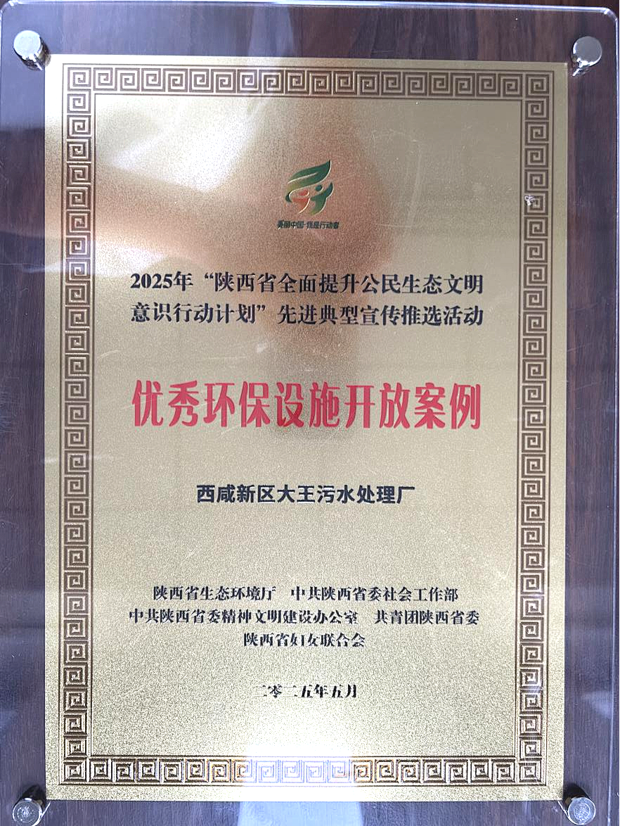 近日,中铁水务沣西运营项目经理部传来喜讯,其运营的大王污水处理厂在 2025 年 “陕西省全面提升公民生态文明意识行动计划” 先进典型宣传推选活动中,荣获优秀环保设施开放案例。这一荣誉的背后,是中铁水务践行中国中铁 “创造 质量 品牌” 新时代企业核心价值观,深耕品牌建设的生动实践。