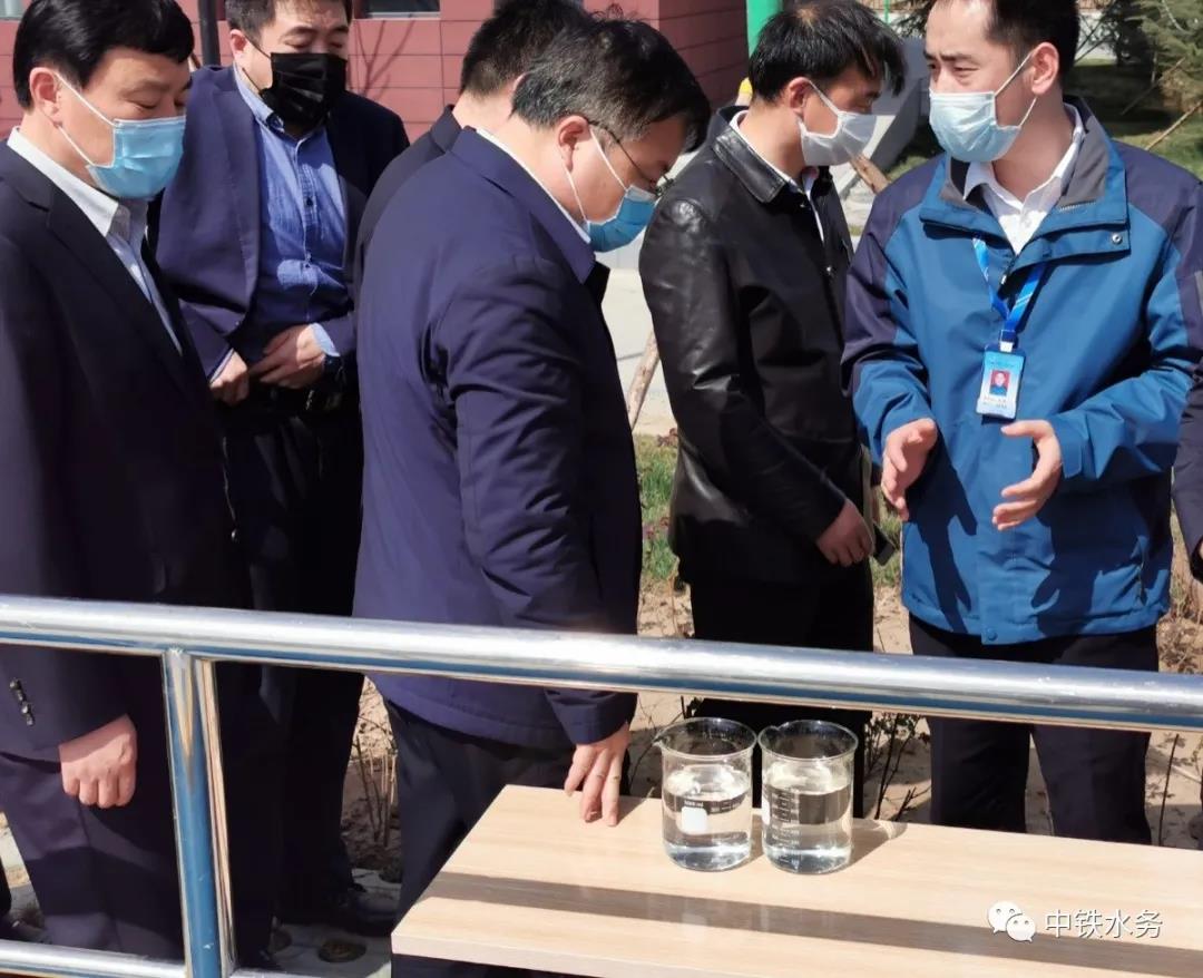鲁强等领导认真检查询问了污水厂的生产运行及疫情防控工作,观摩了厂区“花园式”生化池、二沉池及办公驻地,查看了进水水质、处理后的尾水与自来水的效果对比。在听取了项目经理朱晨对水厂工艺的介绍后,鲁强对大王水厂出水水质达到地表水环境准四类标准,并将处理后的尾水全部排至污水厂北侧的大王活水公园(在建)进行生态补水,用于公园绿地喷灌、道路洒水,实现100%再利用的绿色环保建设理念给予了充分肯定,对中铁水务大王污水厂的运营管理工作给予了较高评价。同时,他希望中铁水务公司继续做好大王污水厂运营管理,为西安市的水污染防治工作做出贡献。